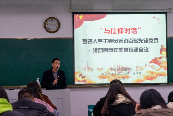 12月16日,我院与舟山市委组织部联合开展“与信仰对话——百名大学生党员采访百名先锋党员”活动启动仪式暨培训会议在公共教学楼101教室举行。舟山市委组织部党员教育中心主任夏明刚、太阳集团tcy8722图书馆馆长王鸳珍、我院院长助理佘红艳、教师华海坤等出席会议,各学院学生党员、预备党员100余人参加会议,会议由华海坤老师主持。