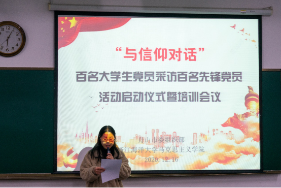 会上,佘红艳老师首先表达对组织部夏主任的莅临表示感谢,并对活动的举办进行了简要的介绍,谈到此次活动是由我院和舟山市委组织部共同举办的一次非常有意义的活动。在启动仪式上,夏主任作了详细的动员讲话,他表示,“与信仰对话——百名大学生党员采访百名先锋党员”是为明年中国共产党成立100周年献礼的一项重要活动,旨在接续传承红色基因,大力弘扬红色文化,进一步彰显舟山优秀党员坚定信仰、担当作为、服务群众、无私奉献的精神风貌。夏主任结合此次采访的先锋党员的事迹,和大家细致谈了四点学习感想:一是学习老一辈人舍生忘死、鞠躬尽瘁的精神;二是学习逆行勇士践行初心、勇担使命的精神;三是学习基层党员服务群众、无私奉献的精神;四是学习行业精英立足本职、勇于创新的精神。