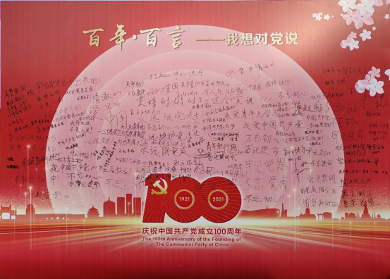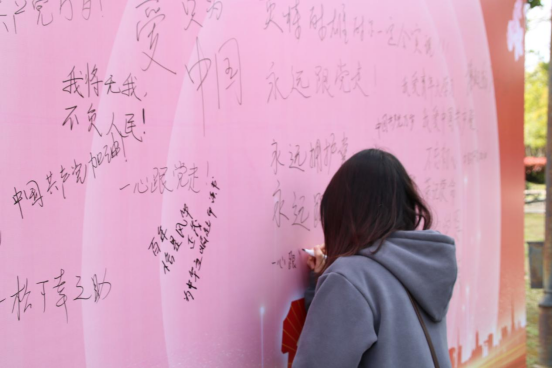 预备的550张积分卡很快告罄,但仍然挡不住同学们参赛的热情,不得已工作人员拿白纸暂时充当积分卡,甚至有同学要求将通关印章盖在身上。顺利通关但仍意犹未尽的同学纷纷驻足在“百年.百言——我想对党说”主题展板前,写下“不忘初心”、“牢记党恩”、“我将无我,不负人民”、“永远跟党走”等真挚感言……活动在热烈、愉悦的气氛中圆满结束。