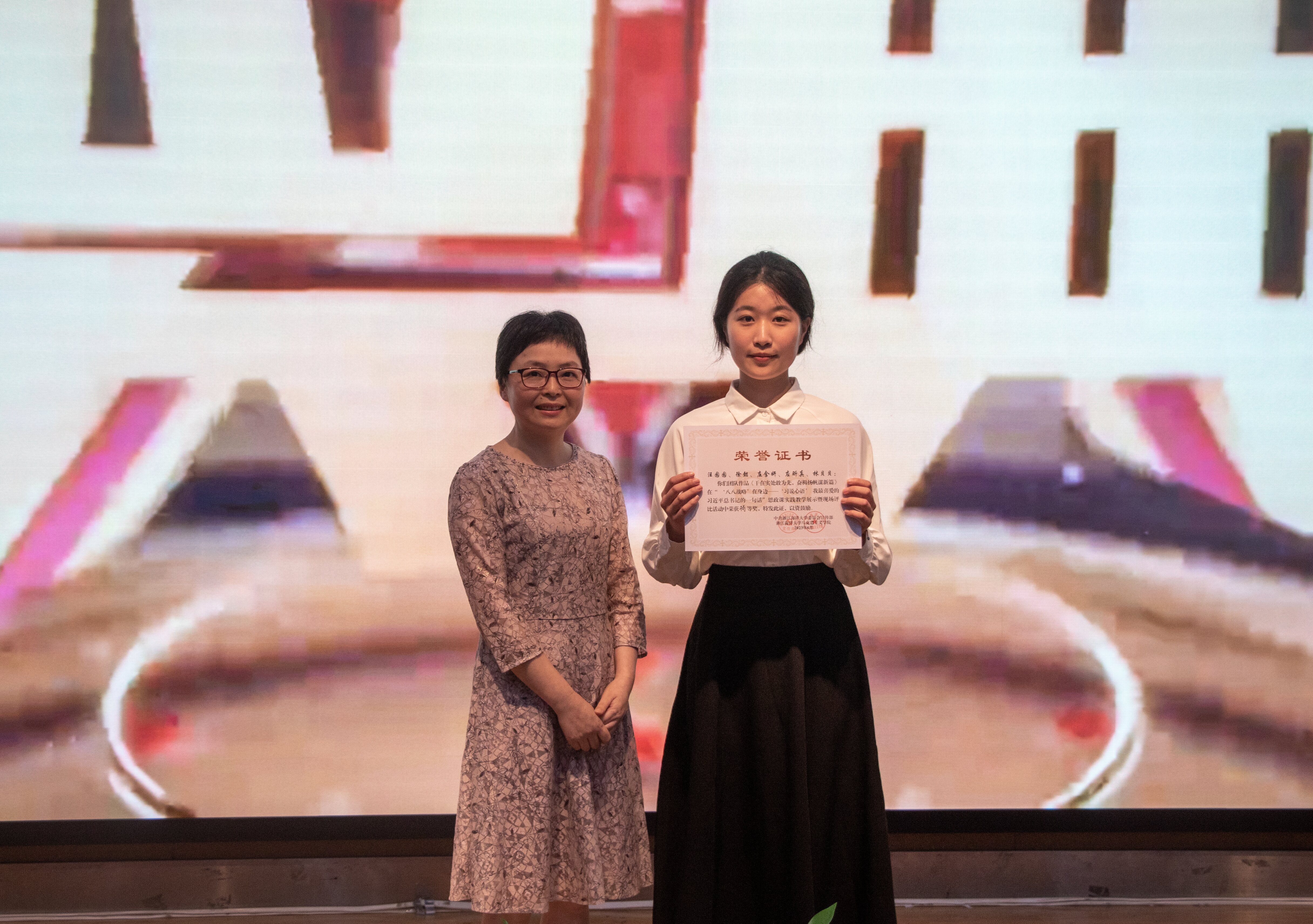 经过激烈的角逐,2021级学生中,B21小教2 班汪园园团队以作品《干在实处敢为先,奋楫扬帆谋新篇》获特等奖,A21英语1 班陈昭容团队、A21环工1班谢心雨团队、B21数学1班唐绯团队分别以作品《“浙”里向海而生,大桥跨向未来》、《“八八战略”与舟山实践》、《以青绿色彩,绘历史长卷》获一等奖。2022级学生中,B22小教4班周瑜璇团队以作品《走新型工业化道路——螺杆振兴》获特等奖,B22中文3 班黄文怡团队、B22小教1班毛口如团队、B22英语2班蓝叶佳团队分别以作品《两代人的二十岁》、《八八战略在身边,海岛开出教育花》、《干在实处、走在前列、勇立潮头》获一等奖。