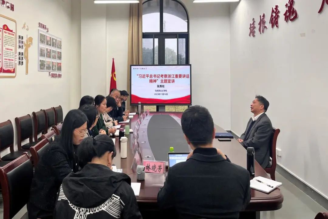 张真柱副校长从深刻领会习近平总书记考察浙江指导浙江的重大意义、情牵浙江心系浙江的深情大爱、指引浙江成就浙江的科学战略、领航浙江激励浙江的重要要求等方面讲解了习近平总书记在浙江考察的丰富内涵和核心要义,同时对学院人才培养、学科建设、师资队伍建设提出了意见建议。张真柱鼓励教师积极开展合作研究,打造优势学科,彰显学院特色。加强师资队伍建设和师德师风建设,提高教师素质能力,造就结构合理、充满活力的高素质专业化教师队伍。