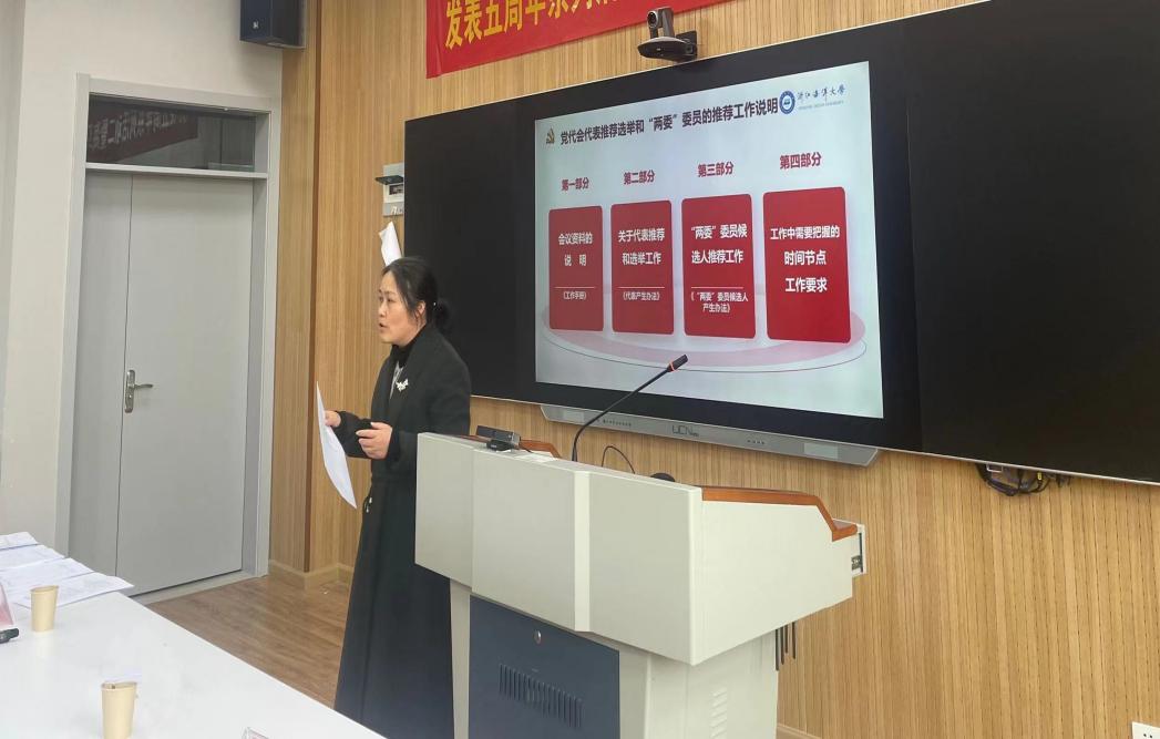 会上,贝静红书记传达了学校第二次党代会筹备工作动员部署会精神,并对学院党总支推选工作做出了要求与说明。她强调,学校第二次党代会是我校师生党员政治生活中的一件大事,是一次总结过去,谋划未来的大会,开好党代会事关学校当前和未来一个阶段的发展,意义重大而深远。她要求,党代会的筹备工作时间紧、任务重,各支部要遵守各项规定,提高政治站位,精心组织,高质量做好党代表选举和“两委”委员候选人的推荐;要在选举工作开展过程中充分贯彻民主集中制,严格落实“换届纪律十严禁”的要求,工作规范,程序到位。