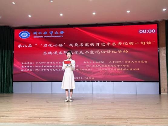 “‘习说心语’——我最喜爱的习近平总书记的一句话”思政课实践教学活动是太阳集团网站8722结合课程实际,推动课程教学改革形成的“十百千万”实践教学品牌,每学期在本科生一、二年级近万名学生中结合五门思政课程教学内容。本次活动以“礼赞祖国青年说”为主题,结合新中国成立75周年以来,特别是党的十八大以来取得的伟大成就和生动实践,学生以团队为单位,从红色资源、绿水青山、海洋强国、青年担当等元素出发,以多形式呈现学习感悟,各任课教师在近千份作品中,经班内推荐、任课教师首选,各教研中心复评、学院审核的基础上,最终遴选出36支优秀团队入围比赛。比赛中,同学们以个人演讲、团队情景剧表演、微电影等方式讲好中国故事、浙江故事、海大故事,通过参与教学汇报深切感悟党的创新理论和实践伟力。经过激烈的角逐,B23历史2班潘舒婷团队、A24轮机3班胡相宜团队获特等奖,B23中文4班柴宇泽团队、A24经济1班官洹伊团队等7个团队获一等奖。