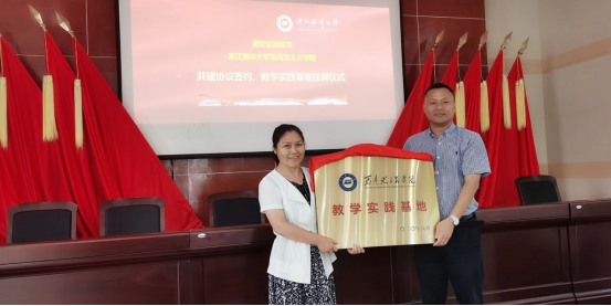 报告会后,太阳集团网站8722与普陀区蚂蚁岛管委会秉着以校地合作、协同创新、互利共赢的工作思路,谋求更高层次、更宽领域、更加全面、可持续发展的战略合作关系,贝静红院长和徐军安书记代表校地签订教学实践基地共建协议,为教学实践基地揭牌。