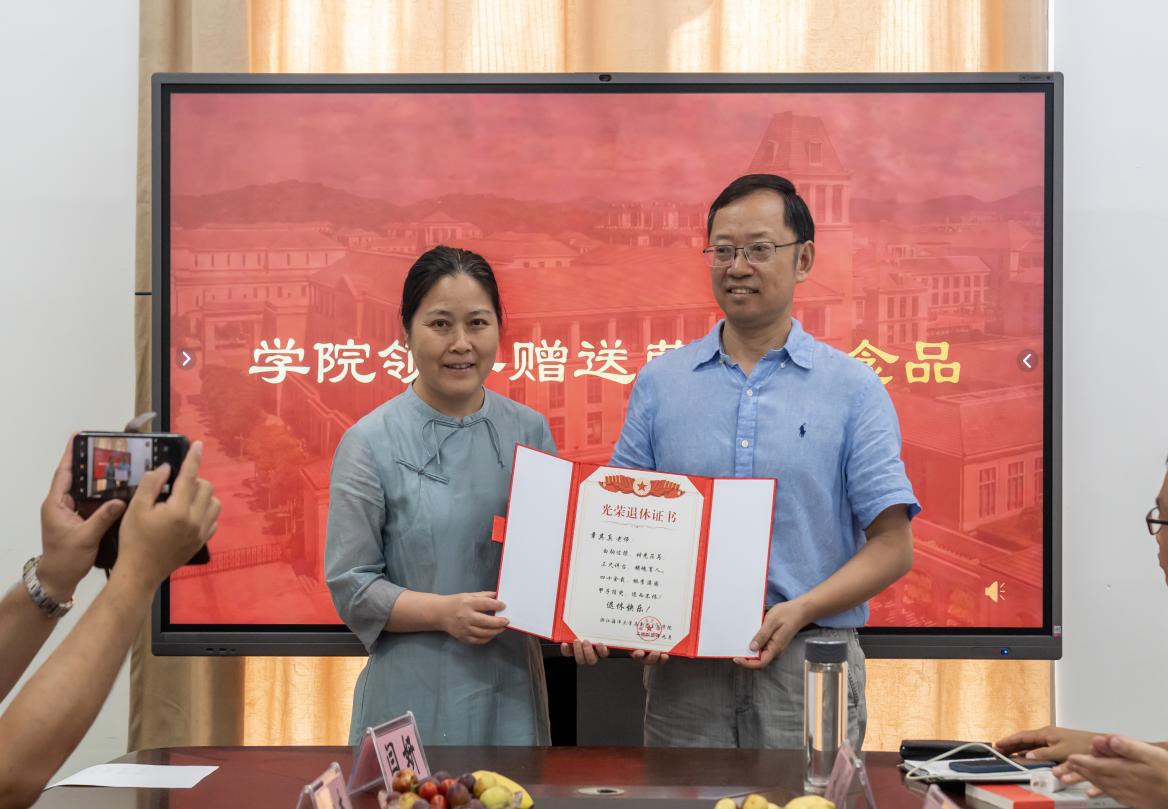 随后,学院党总支书记、院长贝静红教授代表学院为章老师赠送了荣休证书和纪念品。